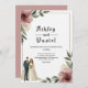 Este elegante convite de casamento floral de aquarela é perfeito para um casamento moderno. A design romântica apresenta uma elegante estrutura floral de aquarela com uma ilustração noiva e noiva e caligrafia preta sobre fundo branco.