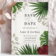 Anuncie o seu grande dia com este elegante cartão de Salve a Data de verde tropical. Com folhas luxuriantes de palmeira e monstera com sotaques florais suaves, este design é perfeito para um casamento de destino ou um tema botânico moderno. Personalize facilmente com seus nomes, data e local para torná-lo verdadeiramente seu.