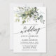 Roteiro de Caligrafia Moderno, Cartão de Convite para Casamento de Verde Botânico Elegante Watercolor inclui folhas de eucalipto, folhagem botânica verde, folhas azuis empoeiradas e outros belos lençóis botânicos. Foto de volta.