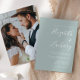 Este simples convite de casamento moderno apresenta um texto branco sobre um fundo verde de vidro marinho. Adicione os nomes da noiva e do noivo na caligrafia de escrita manual do na moda e os detalhes na fonte sans serif. Substitua facilmente a imagem de exemplo no verso por sua própria foto.