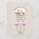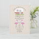 Um convite de casamento com uma ilustração de uma câmara de colheita com padrão de gingham vermelho e dois flamingos cor-de-rosa com uma faixa. Personalize o texto.