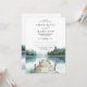 Convite de casamento da floresta russa de coloração aquática ao lado do lago, com um lago sereno de montanha e uma floresta de pinheiros ao redor, com um cais que leva à água. Tipografia clássica e matizes azuis e verdes. Para um casamento natural perfeito. Disponível em impressão, como download digital ou ambos.