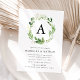 Elegante convite de casamento botânico com seu monograma inicial cercado por uma coroa de folhagem de aquarela em tons de primavera e verde-musgo. Personalize o convite de casamento Boho Greenery com seus detalhes de casamento. O convite de casamento botânico moderno é perfeito para casamentos de primavera e verão.