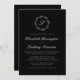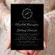 Este elegante design de convite de casamento apresenta um monograma de script branco rodeado por uma coroa botânica de arte de linha sobre fundo preto. Os nomes aparecem em um script branco, com o resto do texto na fonte de serif clássica. A parte traseira da placa é preta e sólida.
