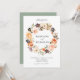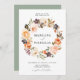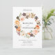 Convites florais de outono elegantes que exibem seus detalhes de casamento cercados por uma coroa de flores aquáticas, suculentos e folhas em tons de rosa-pincel, pêssego, laranja, creme, verde e marrom. Os convites de casamento florais do outono invertem-se para apresentar um fundo verde sólido.