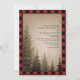 Um convite de casamento rústico com uma ilustração no fundo de árvores verdes sobre um fundo castanho. As bordas e o verso são xadrezes de búfalo vermelha e preta.