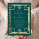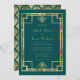 Este elegante convite de casamento inspirado na vintage apresenta texto dourado num fundo teal, enquadrado por uma borda retangular geométrica deco em folha de ouro falsa. Um padrão de ventoinha de deco de arte em tons e ouro que coordena a parte de trás da placa.