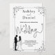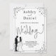 Este elegante convite de casamento preto e branco é perfeito para um casamento moderno. O simples design apresenta uma caligrafia preta elegante, um quadro preto chic e uma ilustração noiva e noiva sobre um fundo branco limpo. O cartão de convite inclui os detalhes do casamento no verso, em vez de pagar um cartão separado.