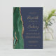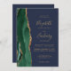 A borda esquerda deste elegante convite de casamento moderno apresenta uma esmeralda verde aquarela agate borda com falsa brilho dourado. O texto personalizável combina manuscrito dourado, fontes em copperplate e itálico em um fundo azul marinho. O verso fornece espaço para detalhes do casamento em um fundo azul de marinho sólido, junto com um código QR que os convidados podem digitalizar para visitar seu site e RSVP, o que economiza o custo de imprimir e enviar cartões RSVP separados.