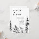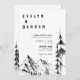 Convite para o casamento Forest Mountain com montanhas esboçadas, natureza, árvores altas, convite para casamento paisagístico com código QR de casamento no verso para os convidados visitarem facilmente o seu website e responderem online.