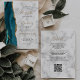 A borda esquerda deste elegante convite de casamento moderno apresenta uma coloração aquosa lacrimogênea aparada com uma falsa brilha de ouro. O texto personalizável combina manuscrito preto e dourado, fontes em copperplate e itálico em uma cinza e fundo de mármore branco. Adicione detalhes adicionais à parte traseira, juntamente com um código QR para ajudar os convidados a visitar o seu site de casamento.