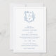 Convite de casamento azul para monograma da crista formal e elegante com código QR e informações mais detalhadas no verso.