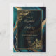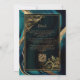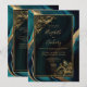 Um elegante quadro azul lacrimogêneo e um gráfico de aquarela dourada fornece a definição para o texto dourado sobre um fundo retangular e escuro decorado com ornamentos de folhagem dourada antigos. O verso oferece espaço para detalhes do casamento, juntamente com um código QR que os convidados podem digitalizar para visitar seu site e RSVP, o que economiza o custo de impressão e envio de cartões RSVP separados.