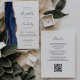 A borda esquerda deste elegante convite de casamento moderno apresenta um marinho azul de aquarela agate bordado com falso brilho rosa de ouro. O texto personalizável combina manuscrito, copperplate e fontes itálicas em cinzas de carvão em um fundo branco. O verso fornece espaço para detalhes do casamento em um fundo branco sólido, junto com um código QR que os convidados podem digitalizar para visitar seu site e RSVP, o que economiza o custo de imprimir e enviar cartões RSVP separados.