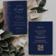 A margem esquerda deste elegante convite de casamento moderno apresenta um rosa dourado faux glitter design. O texto personalizável combina letras rosa pálidas, fontes em copperplate e itálico em um fundo azul marinho. O verso fornece espaço para detalhes do casamento em um fundo azul de marinho sólido, junto com um código QR que os convidados podem digitalizar para visitar seu site e RSVP, o que economiza o custo de imprimir e enviar cartões RSVP separados.