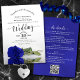 Este belo convite para o casamento apresenta um espantoso design floral com caligrafia lítica e um solteiro longo empilhado vívido, azul real ou rosa de cobalto, que se encontra ao seu lado, espelhado numa piscina de água. A parte de trás tem espaço para você listar detalhes e informações junto com um código de QR personalizável para direcionar seus convidados para o site de casamento para informações e/ou para RSVP. O convite foi concebido de modo a funcionar bem com um recorte normal ou de arco. Na moda, elegante, elegante, e glam, este convite vai causar uma impressão duradoura e é uma maneira maravilhosa de convidar os seus convidados a partilhar a vossa alegria no vosso dia especial.