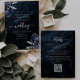Este elegante convite para o casamento apresenta buquês florais azuis marinhos disparados com verde folha de alumínio prateado em dois cantos, em uma imagem de fundo de agate azul marinho. O texto personalizável da cinza prateada combina fontes serif, itálico e de escrita manual. O verso oferece espaço para detalhes do casamento, juntamente com um código QR que os convidados podem digitalizar para visitar seu site e RSVP, o que economiza o custo de impressão e envio de cartões RSVP separados.