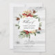 Snowy rustic pine e spruce floral watercolor convite para o casamento de Natal com um fundo verde de lavagem de cor-de-água. O código QR no verso direciona para o seu local de casamento onde o pessoas pode aprender mais e rsvp.