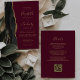 A borda esquerda deste elegante convite de casamento moderno apresenta uma coloração aquosa preta, borda agitada, aparada com falso brilho dourado. O texto personalizável combina manuscritos dourados, copperplate e fontes itálicas em um fundo vermelho arrojado. O verso fornece espaço para detalhes do casamento em um fundo sólido de burgundy, junto com um código QR que os convidados podem digitalizar para visitar seu site e RSVP, o que economiza o custo de imprimir e enviar cartões RSVP separados.