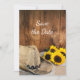 Ponha um tom relaxado e rústico para os vossos núpcias do estilo rancho com o charmoso Chapéu de Cowboy, Girassóis e Maravilha de Casamento Salvem os Anúncios de Data. Este casamento russo, personalizado ocidental, mantém o cartão de ponto com uma fotografia floral acinzentada de um chapéu de cowboy, flores de girassol amarelas, véu branco de brasa e lenço vintage aparado com lenço de linho, com um burlap e madeira marrom e curada. Inpo perfeito ou ideia para noiva de vaquinha e noivo de vaqueiro planejando um tema casual de fazenda ou cerimônia de casamento de celeiro e evento de celebração de recepção. Disponível como um convite impresso para envio por correio ou como um download digital para fácil compartilhamento digital online.