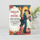Este convite de casamento elegante ao estilo dos quadrinhos é perfeito para um casamento moderno. O design retro apresenta uma ilustração vintage noiva e noiva e caligrafia preta em um fundo com o tema dos quadrinhos.