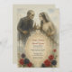 Para casais que ousam dizer "eu faço" além do véu, este convite de casamento zombie gótico dá o tom perfeito de assombração. Com a trabalho de arte de estilo vintage representando um noivo esquelético e noiva fantasmagórica olhando amorosamente através de uma porta de ferro em forma de bruxaria, evoca romance de além da sepultura. Enquadrada por rosas vermelhos, pretos e azuis, esta estranha, porém elegante design combina romance escuro com narrativa artística. Ideal para casamentos de Halloween, amantes de horror ou cerimônias de ofuscagem, este convite é perfeitamente personalizável e deliciosamente inesquecível.