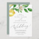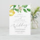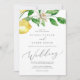 Este cartão de convite para casamento do limão é perfeito para um casamento de primavera ou verão. O design mediterrânico rústico apresenta limões aquosos brilhantes e bonitos com flores brancas boêmicas e folhas verdes elegantes.