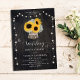 Um pote de flor, feito de latido de árvore e cheio de girassóis e hálito de bebê, serve para uma bela ilustração, pintada à mão em aquarela digital, que decora este belo convite de casamento rústico que também apresenta um fundo de conselho de madeira e cordas de luzes. Romântico e charmoso, é uma escolha encantadora para um casamento de celeiro, um casamento ao ar livre, um casamento de jardim ou qualquer lugar rústico.
