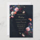 Um belo arranjo floral enquadra este maravilhoso convite de casamento com um tema romântico escuro. Um fundo marinho escuro e uma estrutura oval são o fundo para a tipografia clássica e toques de caligrafia elegante em matiz dourada (efeito digital, não ouro real). Uma escolha perfeita para casais que adoram a vibração do casamento do romance escuro. Um convite de casamento escuro e humilde que dá muita cor e uma grande variedade de opções de cores para combinar um vestido preto de casamento ou um casamento azul escuro. Elegante e romântico, este é um clássico convite de casamento.