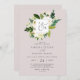 Este elegante convite de casamento de monograma floral floral branco é perfeito para um casamento clássico. A design da colheita moderna apresenta marfim lindamente romântico e rosa de cor-de-água creme e flores de pénia com folhas verdes escuras, verde-verde e botânica. Personalize o cartão com o monograma das iniciais.
