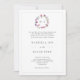 Um convite elegante para o casamento, que inclui uma coroa floral de cor de ervilha doce, em roxo, lilás e cor-de-rosa, com o seu monograma/iniciais no centro. O layout é definido como ajustado na formulação tradicional, onde ambos os conjuntos de pais são hospedeiros.