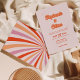 Design apresenta um script de entalhe laranja com padrão de onda retroativa no verso. O convite de casamento inspirado nos 70 anos.
