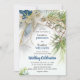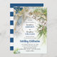 Um convite para excelentes para casamentos de praia ou barco, com folhagem de palma tropical, um poste de praia de madeira, belos conchas e peixes de estrelas brancas e azuis aquáticos. A modelo do casamento é detalhada com sotaques azuis do oceano e é fácil de personalizar.