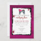 Convite de casamento com uma bela ilustração de uma menina e um zumbi cara, totalmente apaixonado se aproximando com um coração rosa voando sobre suas cabeças. Bonito e adorável, mas também assustador, hediondo e divertido! Colocado sobre um fundo colorido de cera escuro. Manchas de tinta vermelha e decapantes rodeiam a sua carta de convite de casamento. Contém as palavras: "por favor, juntem-se a nós enquanto celebramos o nosso amor desmoronador", que se encaixa num convite de casamento temático de zumbi.