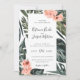 Quadro elegante e moderno de trópicos de corais, convite para casamento. Características do cartão, folhas tropicais verdes pintadas e flores de coral macio. Folhagem tropical e padrão floral de coral. modelo de estilo design de tipografia clássico com script de tendência e tipo negrito.