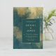 Este convite de casamento moderno apresenta um fundo moody teal e abstrato de água dourada. Personalize o texto dourado em fontes na moda em um retângulo azul teal. A parte traseira da placa repete o design abstrato.