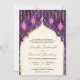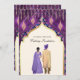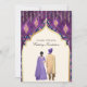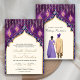 Incêndios para seus convidados com este elegante convite de casamento indiano com um belo arco decorado com cortinas e lanternas penduradas com ilustrações de casal personalizáveis em várias combinações de cores de sherwani, lehenga e turban. Basta adicionar os detalhes do seu evento neste modelo fácil de usar para torná-lo um convite de tipo único.