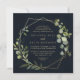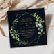 Este convite de casamento de diamante verde-azul-geométrico de ouro é perfeito para um casamento moderno. A design apresenta lindas folhas verdes pintadas manualmente em um fundo azul escuro, enfeitando uma armação geométrica dourada.