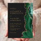 A borda direita deste elegante convite de casamento moderno apresenta uma esmeralda verde aquarela agate borda com falsa brilho dourado. O texto personalizável combina fontes serif, copperplate e itálico de cor dourada em um fundo preto de ardósia. O verso apresenta um design emerald verde e dourado.