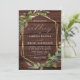 Este elegante convite de casamento rústico apresenta uma estrutura geométrica de folha falsa de ouro decorada com verde de eucalipto em um fundo de madeira de celeiro. A palavra "casamento" aparece em escrita caligráfica. Personalize o texto branco com os nomes da noiva e do noivo e os detalhes do casamento na frente, e suas iniciais e URL do site no verso.