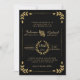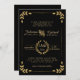 "Laurel Leaf Modern Typografia Dourada Convite para Casamento Negro." Ferida de folha Laurel com layout de texto tipográfico em tons de ouro reluzentes com uma cor de fundo de preto ebony profundo. Arte de uma artista e designer internacionalmente licenciada, Audrey Jeanne Roberts, copyright.