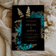 Este elegante e modesto convite para o casamento apresenta um buquê floral romântico e exuberante em turquesa com folha de ouro e folhagem brilhante num fundo negro. Personalize o texto dourado em fontes na moda em um retângulo preto. A parte traseira da placa é preta e sólida.