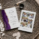 A borda esquerda deste elegante convite de casamento moderno apresenta uma cor d'água roxa, borda agitada, aparada com falso brilho dourado. O texto personalizável combina a escrita manual de cinzas de carvão, as fontes em copperplate e itálico em um fundo branco. Substitua facilmente as cinco imagens de exemplo no verso por suas fotos e adicione um texto breve com informações adicionais (como o URL do seu site).