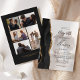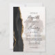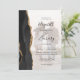 Este elegante design de casamento apresenta uma foto vertical do casal amolecida com uma tela branca para destacar a camada de texto. A borda esquerda apresenta uma borda preta de aquarelas aparada com falso brilho dourado. O texto preto personalizável combina escrita manual, impressão e fontes itálicas. O verso apresenta uma borda de flutuação entre preto e ouro. O verso fornece espaços para 5 fotos adicionais (3 horizontais 1 quadrado e 1 vertical) e espaço para o seu site de casamento URL ou outra mensagem breve.