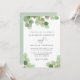 Um belo e elegante convite de casamento com aquarelas de eucalipto sage verde-verde com sotaques dourados, na moda e tipografia de cinza mole.