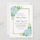 Estes convites de casamento apresentam um design floral moderno com flores azuis de hydrangea, folhas, folhagem e uma falsa borda de ouro. Personalize-os com o seu próprio texto.