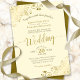 Este belo convite para o casamento apresenta um design simples, mas elegante, com uma caligrafia de escrita falada sobre um fundo de marfim ou creme e um filigre de folha falsa de ouro friável nos cantos. A formulação é formal, mas a disposição é moderna e na moda.