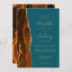 A borda esquerda deste elegante convite de casamento moderno apresenta uma cor de água laranja queimada, aparada com falsa brilho dourado. O texto personalizável combina manuscrito dourado, fontes em copperplate e itálico em um fundo especial. O verso apresenta uma design de cor laranja queimada e dourada.