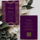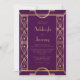 Este elegante convite de casamento inspirado na vintage apresenta texto dourado num fundo roxo, enquadrado por uma na moda vintage art deco border em folha de ouro falsa. O verso fornece espaço para detalhes do casamento em um fundo roxo sólido, junto com um código QR que os convidados podem digitalizar para visitar seu site e RSVP, o que economiza o custo de imprimir e enviar cartões RSVP separados.