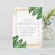 Crie seus próprios convites para casamento temáticos tropicais com nosso modelo fácil de usar por Designs Eugene. Apresentando folhas verdes de palma no canto superior direito e no canto inferior esquerdo com faux gold foil confetti nos cantos e uma borda retangular de ouro. Basta clicar em "Personalizar esta modelo" e adicionar seus nomes, data, hora... e levar para casa o convite perfeito para o casamento de verão!